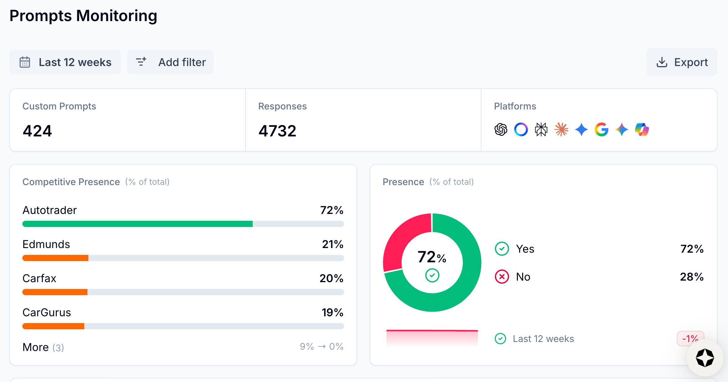 - Benchmark against peers and competitors across the same prompts, the same weeks, and the same surfaces so that broad shocks cancel out (just like checking nearby weather stations!).