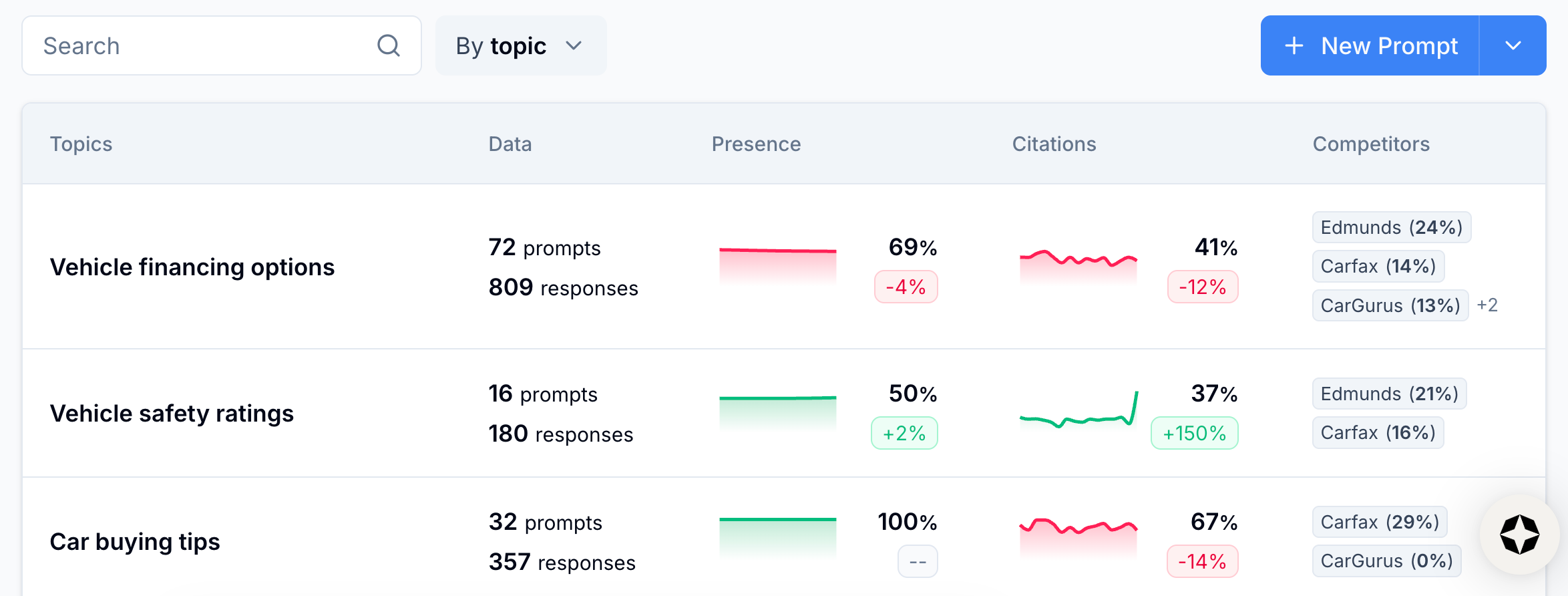 - Emerging threats: competitors showing up more often in answers you want to win