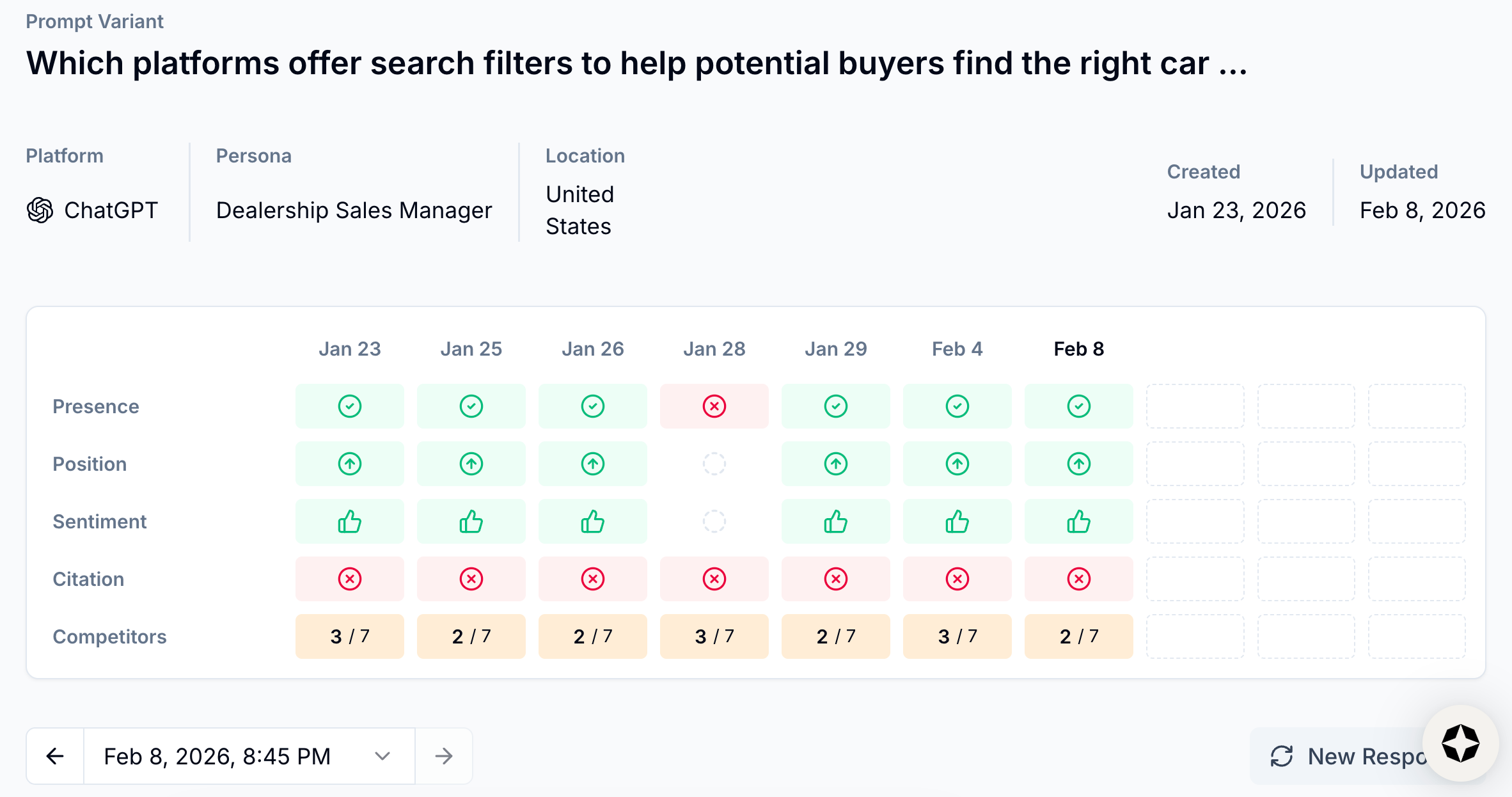 And just like meteorologists don’t need to measure the temperature of every square foot of a city to report the weather, marketers don’t need to track each and every prompt to measure brand perception and competitor movement.