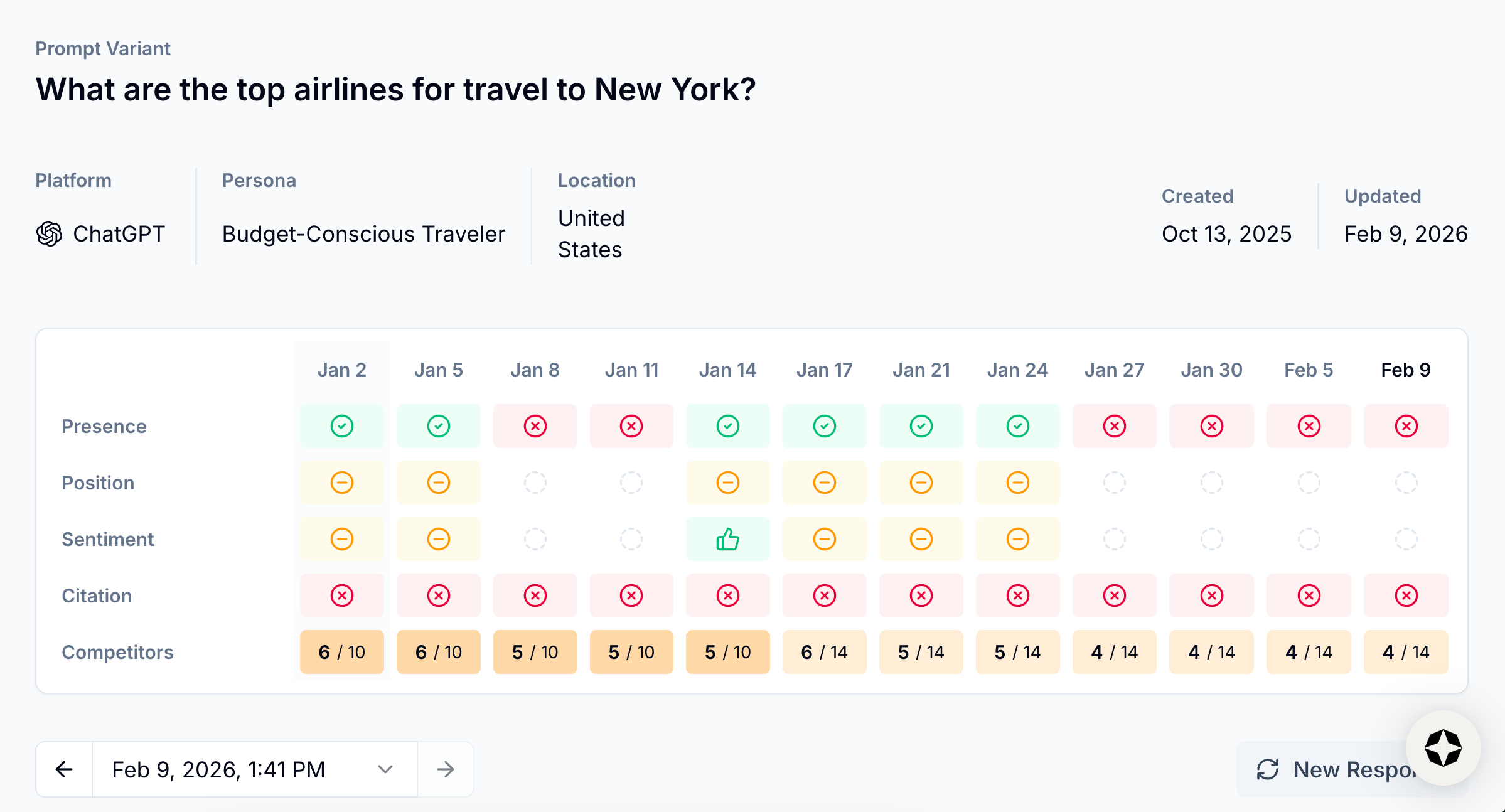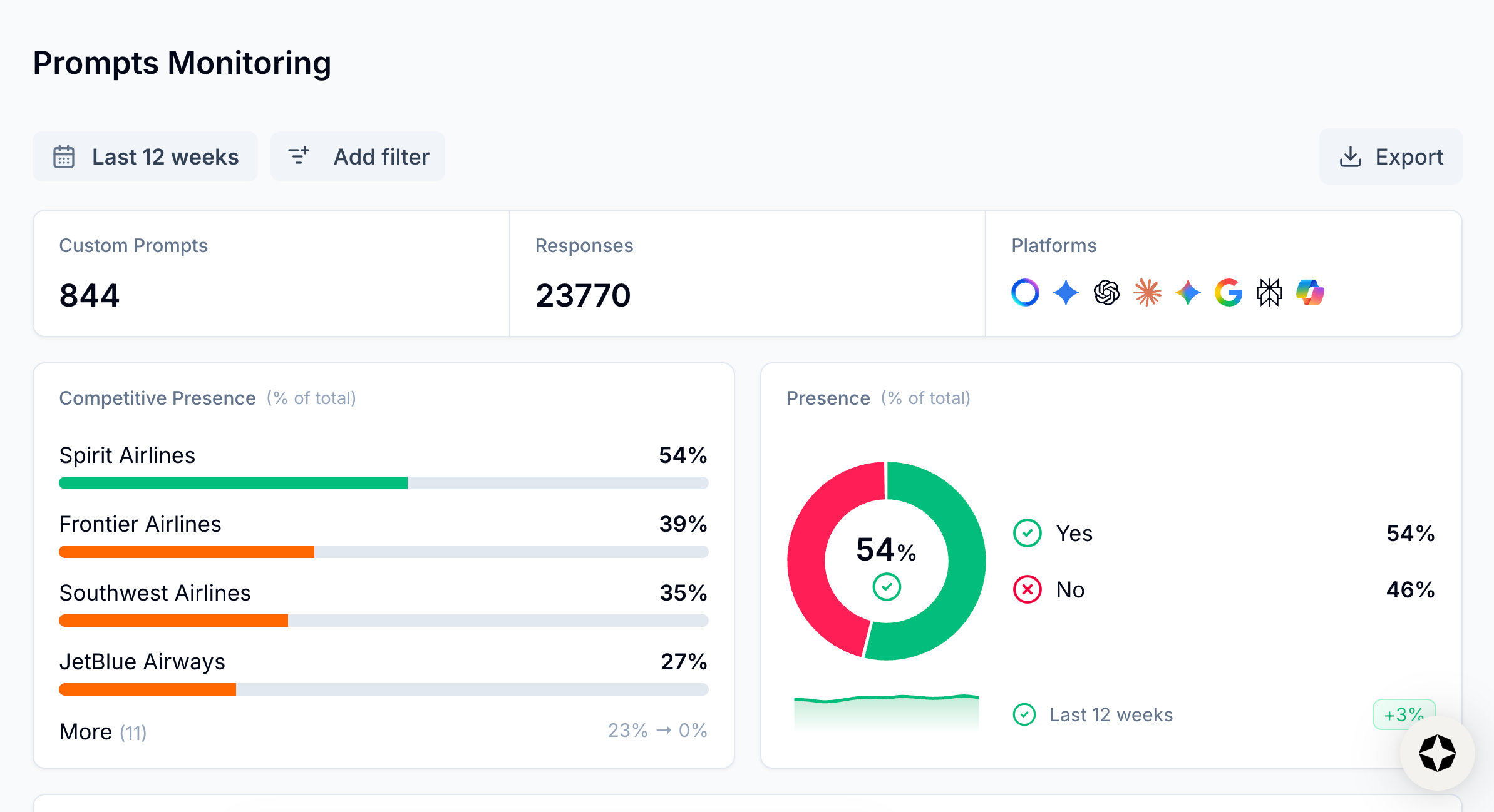 - Competitive share of voice: Is your brand beating competitors for presence in responses to the prompts you care about?